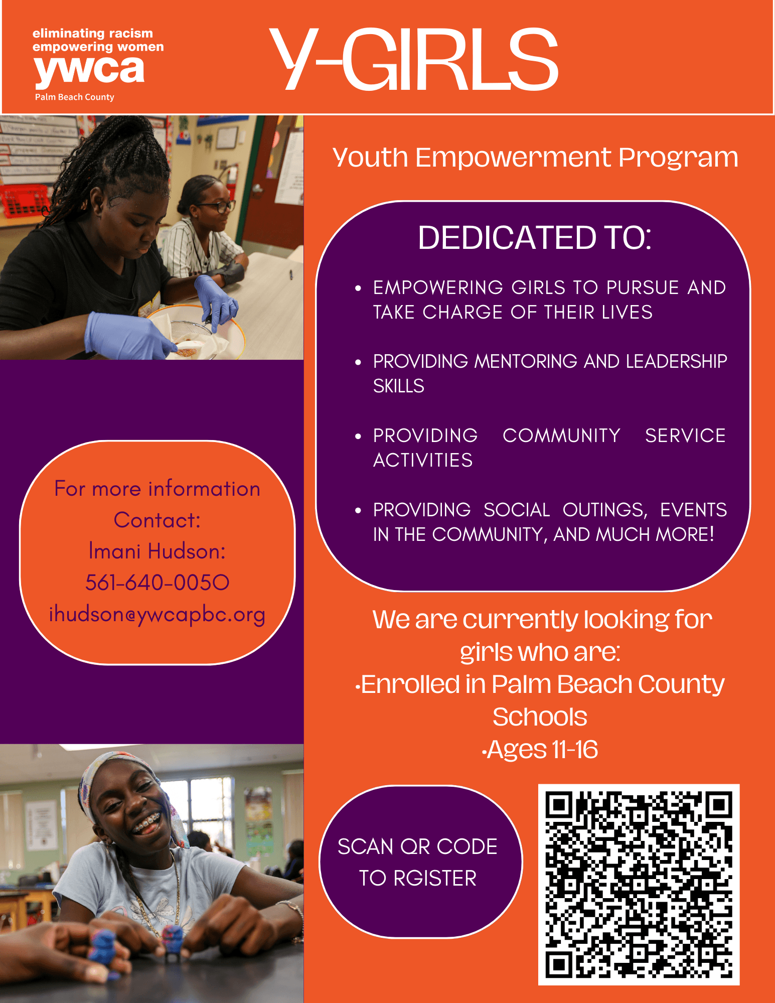 We are currently looking for girls ages 11-16 to participate in our Y-Girls program.